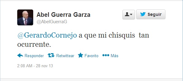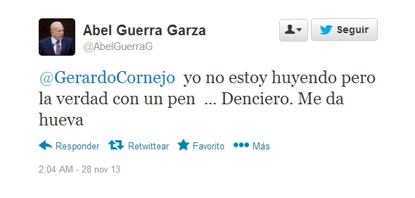 Además hay que mencionar lo mal que está manejando sus redes sociales Abel Guerra, ya van varias veces que el Diputado Federal insulta a ciudadanos que lo cuestionan por cualquier asunto relacionado con su trabajo, la noche de ayer se burló e insulto a una persona en la red social de Twitter, diciéndole “chisquis” de chisqueado y “pen…Denciero” de pendejo, hágame el favor, qué clase de político es.