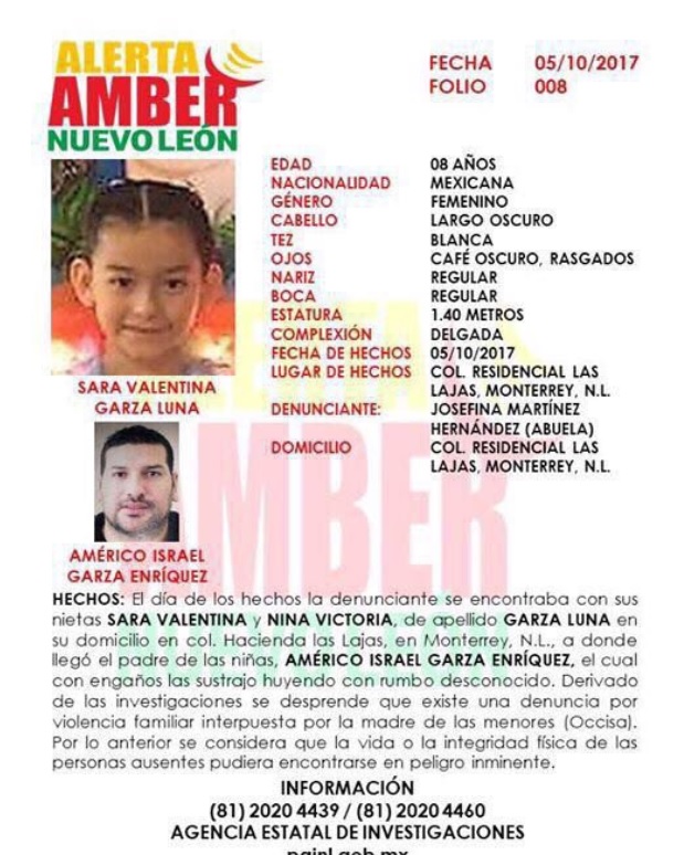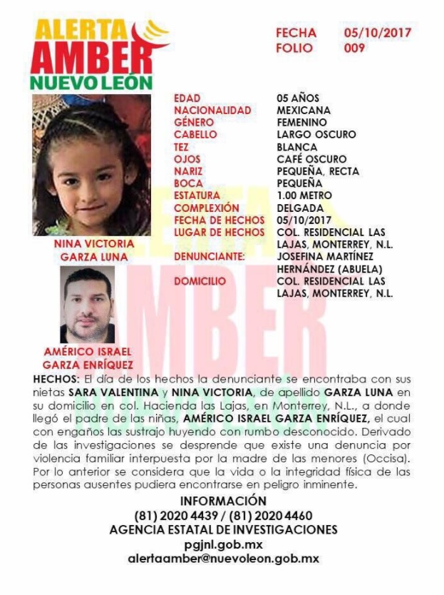 Por su parte la Procuraduría de Justicia de Nuevo León emitió una Alerta Amber, para tratar de localizar a Sara Valentina de 8 años y a Nina Victoria Garza Luna de 5 años de edad, luego de la denuncia interpuesta por la abuela materna de las pequeñas, la señora Josefina Martínez Hernández, quien indicó a las autoridades que Américo Israel Garza Enríquez, llegó a su domicilio en la Colonia Residencial Las Lajas, en la Ciudad de Monterrey, Nuevo León y con engaños se llevó a sus nietas con rumbo desconocido.