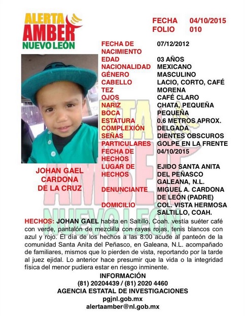Autoridades del Gobierno del Estado de Nuevo León, activaron la Alerta Amber debido al reporte de un menor desaparecido en el Municipio de Galeana, identificado como Johan Gael Cardona de la Cruz, de 3 años de edad.