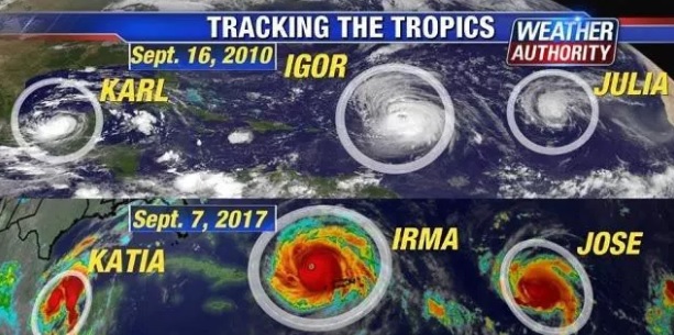 Los científicos han afirmado que las tormentas que en días pasados azotaron el Caribe, territorio de México y los EEUU, no es una casualidad, ya que cientos de especialistas en meteorología, dieron a conocer la evidencia que muestra que la coincidencia de posición de los últimos huracanes, coinciden con los de hace 7 años, una foto de satélite muestra a Irma, José y Katia, se encuentran en la misma posición de los pasados Karl, Igor y Julia, afirmando que indiscutiblemente éstos han sido hechos por el hombre, apuntando directamente a HAARP.