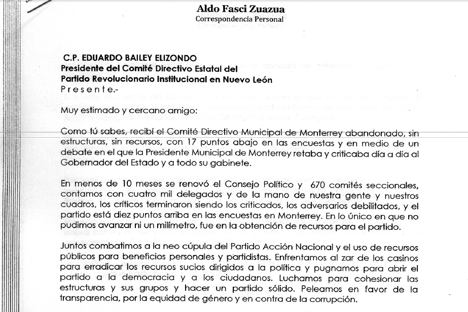 En una carta dirigida a Eduardo Bailey Elizondo y a la dirigencia del PRI, Aldo Fasci destapa su sentir por los actuales movimientos políticos, los cuales él considera como desafortunados.
