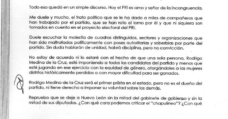 «Me duele y mucho, el trato político que se la ha dado a miles de compañeros que han trabajado por el partido, que se han roto el lomo por él y que ni siquiera son tomados en cuenta en el proyecto electoral del PRI«, expuso en la carta.