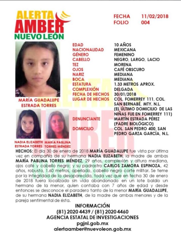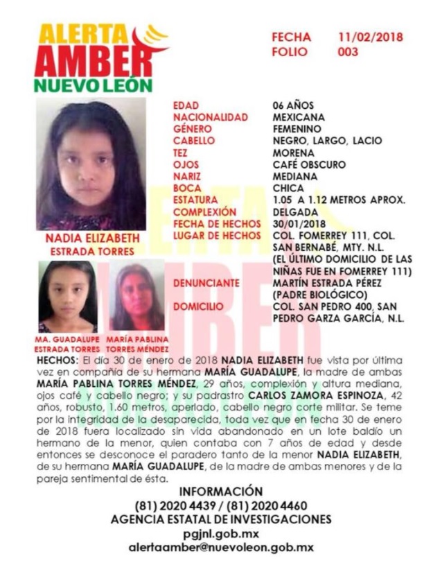 Las menores fueron vistas por última vez el pasado 30 de enero en compañía de su madre María Pablina Torres Méndez de 29 años de edad y del padrastro Carlos Zamora Espinoza de 42 años, quienes tenían su domicilio en la Colonia Fomerrey 111 del sector San Bernabé en Monterrey.