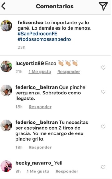 Su foto de perfil es de un cadáver ensangrentado quien aparentemente fue ejecutado de un disparo en la cabeza, Fernando Elizondo señaló que la amenaza fue recibida el día de ayer y se lee: “Tu necesitas ser asesinado con 2 tiros de gracia. Yo me encargo de eso pinche grifo”.