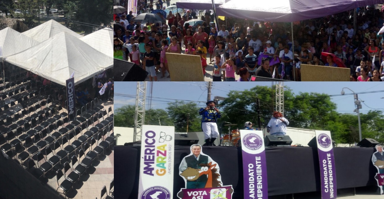 El martes pasado Américo convocó a un mitin político en la Plaza Principal de Juárez, en el cual estuvo presente el candidato independiente presidencial, Jaime Rodríguez Calderón «El Bronco», evento en la cual se esperaban a más de 5 mil personas, ya que esa fue la cantidad «mínima» que le exigió la gente de El Bronco para que éste pudiera presentarse a darle su apoyo en Juárez, Nuevo León, penosamente, Américo le falló de nuevo a su ex jefe, ya que solo pudo reunir a tan solo 400 personas, mismas que en su mayoría eran niños y niñas, ya que éstos fueron llevados para ver a un grupo de payasos.