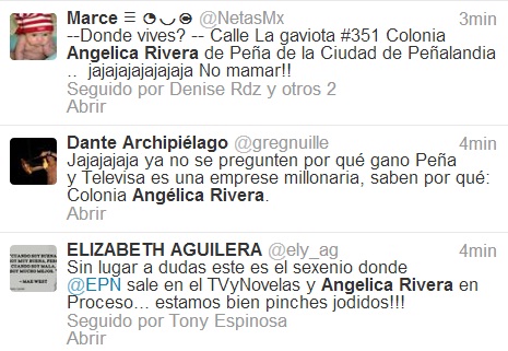 La reacción en la red social Twitter no se hizo esperar, siendo nuevamente objeto de burla la Primera Dama de México Angélica Rivera, aquí algunos de los tuits que se han generado a lo largo de la mañana:
