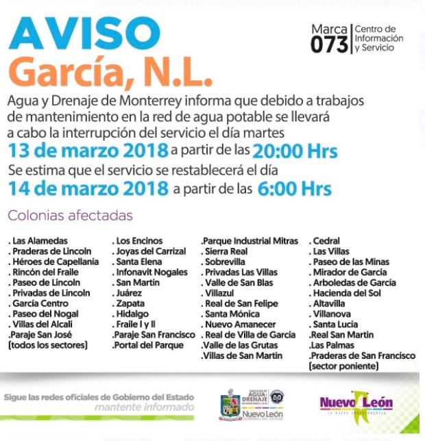 Mediante sus redes sociales, Agua y Drenaje de Monterrey, informó que se cortará el servicio del vital líquido en varias colonias del Municipio de García, esto debido a trabajos de mantenimiento de la red de agua potable.