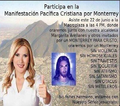 Sin embargo lo que no se vale es poner el nombre de la alcaldesa Margarita Arellanes como bandera, en donde la falsa manifestación será para orar por un Monterrey sin: violencia, homosexuales, travestis, metaleros, etcétera. Con esa «invitación» ofenden a la comunidad gay, así como están discriminando a las personas que gustan del animé o la música rock.