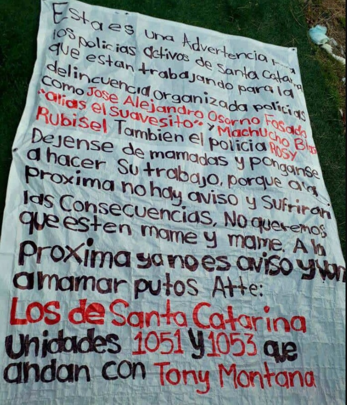 En la narcomanta, se encontró un mensaje amenazante contra elementos de la Policía del Municipio de Santa Catarina. La misma fue colocada en el cruce de Primera de Mayo y Clouthier.