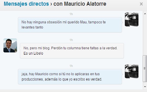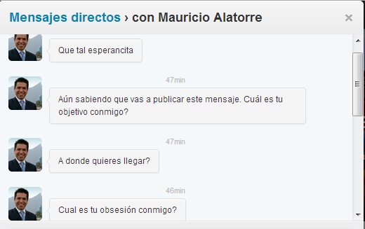 Ahora les voy a compartir mis queridos que Mauricio Alatorre González me dio follow en mi cuenta de Twitter @EsperancitaCom, al yo percatarme pensé: “Quiere reclamarme algo”, y lo seguí porque yo nunca le he tenido miedo, ni le tengo ni le tendré, ni a él ni a ninguna persona y a ningún reclamo, siempre he intentado contestar en la manera en que me ha sido posible por cuestiones de tiempo todas y cada una de las menciones y mensajes directos, así que sabía que Mauricio lo haría, aquí los mensajes recibidos:
