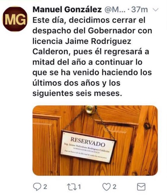 Fue el propio Manuel quien publicó en sus redes que el despacho del Gobernador quedará “reservado” para Jaime Rodríguez, que según hasta que regrese. Y en el letrerito que le colgaron a la puerta se lee: “Fue en busca de la libertad de todos los mexicanos”. Nombre qué, se entiende que Manuel no entrará a la oficina, pero la que sí despachará desde ese lugar es la suegra del Bronco, no hay duda.