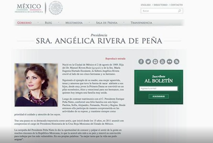 A partir del día de hoy, la imagen de la Primera Dama de México, Angélica Rivera, ha sido retirada de la página de Internet de la Presidencia de México, de igual manera no pueden verse en el sitio fotos y el link de su perfil que aparecía en un costado.