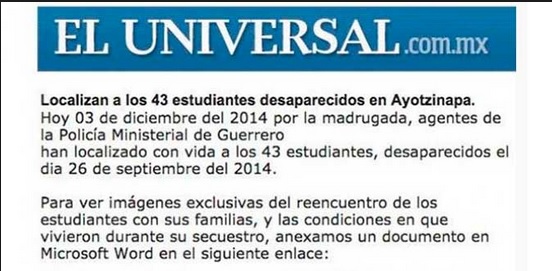 La falsa noticia de la localización con vida de los 43 estudiantes normalistas de Ayotzinapa, ha sido el nuevo «gancho» para que algunos caigan en la trampa del phishing. Esto comenzó a circular en un correo a nombre de El Universal, mediante la dirección suscripciones.digitales@ eluniversal. com. mx, aunque el medio informativo ya se deslindó de la situación.