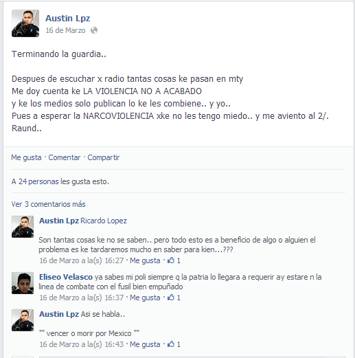 Esto no solo pasa en la Fuerza Civil, también se pueden ver a elementos de la Policía Estatal presumiendo sus armas en la red social de Facebook, es algo que no se debe hacer ya que mientras ellos se toman la foto para el “Face”, los malandros hacen de las suyas, quisiera saber la opinión del Comisario de la Fuerza Civil, Felipe de Jesús Gallo, ya que según él sus elementos son un ejemplo a seguir.