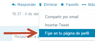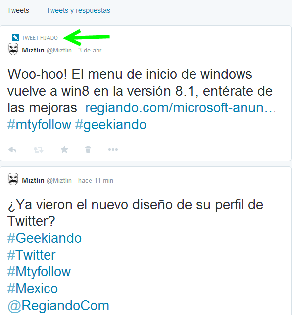 Puedes fijar unos de tus mejores tuits en la página principal de tu perfil, de esta manera cualquier persona que visite tu perfil podrá ver el tuit de tu elección fijado en la página principal, y aparecerá de esta manera: