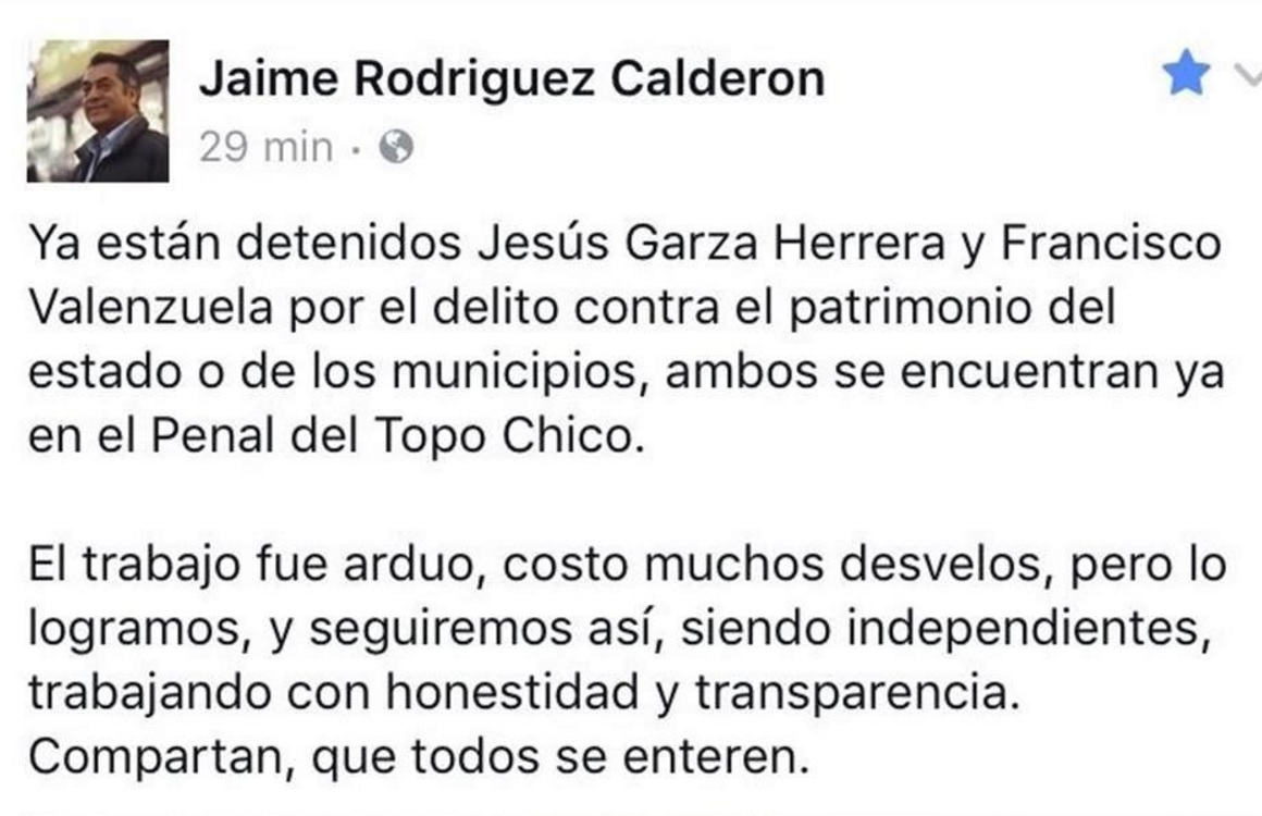 Ya salió el peine del por qué Jaime Rodríguez Calderón borró su mensaje de festejo en Facebook, en donde había anunciado la detención de los dos ex funcionarios de la administración de Rodrigo Medina, el bronco aseguraba que eso era gracias a un trabajo arduo y a muchos desvelos, pero al darse cuenta Jaime de su realidad decidió borrar dicho post en su página de Facebook, y es que hasta alguien como él que no es tan brillante que digamos, le cayó el veinte de lo que podría pasar si dejaba ese post, sabía que corría el riesgo de ser blanco de burlas si esos ex funcionarios fueran agraciados por algún recurso legal y así fue.
