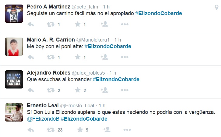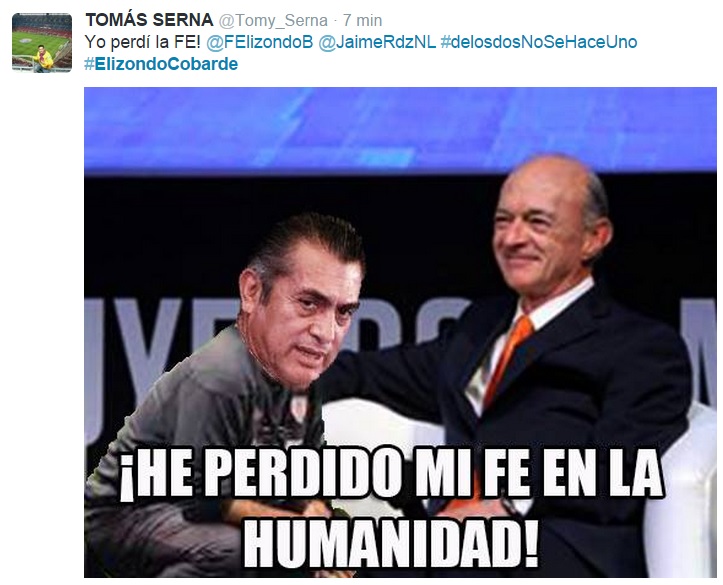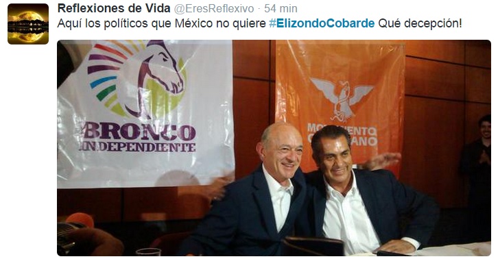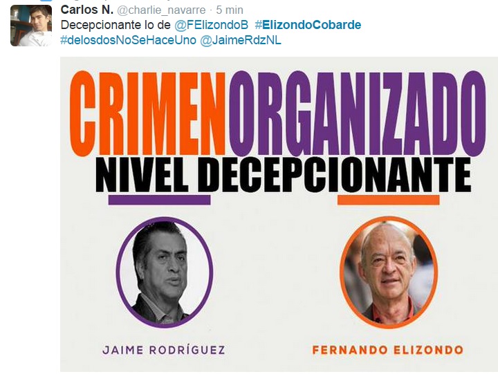Ante la declinación de su candidatura a la Gubernatura por Movimiento Ciudadano, Fernando Elizondo Barragán, para formar la llamada «Alianza por la Grandeza» con el candidato independiente Jaime Rodríguez Calderón, alias el bronco, los reclamos por esta «alianza» no se hicieron esperar en la red social de Twitter.