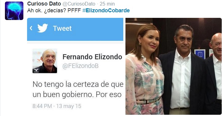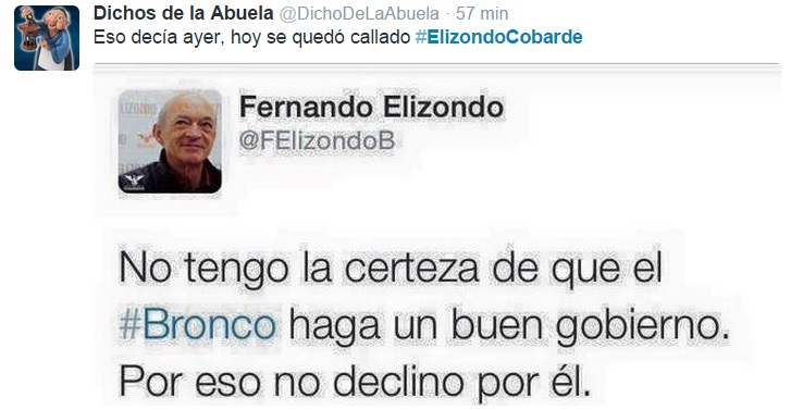 Y aunque todavía no ha presentado su declinación oficial ante la Comisión Estatal Electoral, Fernando Elizondo es uno más de los llamados «broncos», aquí algunos de los reclamos al candidato que por segunda ocasión en su vida, renuncia 15 días antes a su candidatura para contender por el puesto de Gobernador de Nuevo León, aquí algunos memes y tuits que hicieron tendencia #ElizondoCobarde:
