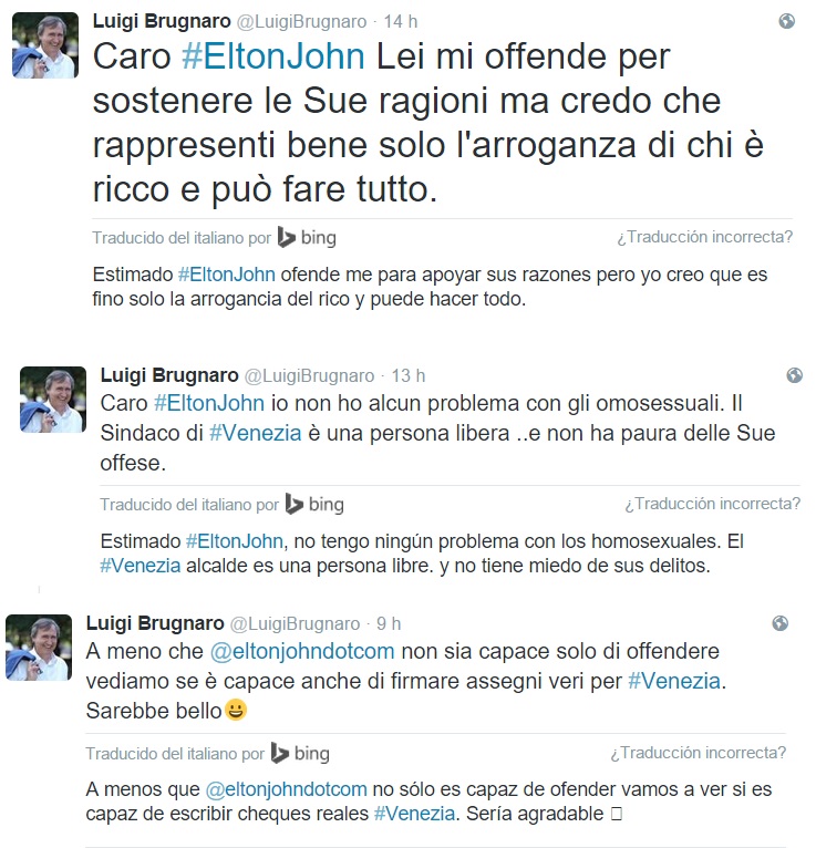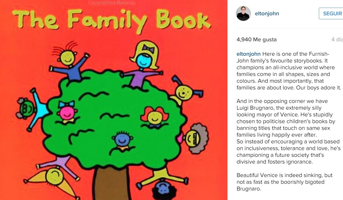 El Alcalde ordenó retirar de las escuelas un total de 49 libros que orientan a los estudiantes al respeto étnico, a los homosexuales y a las personas con discapacidad, motivo por el cual Elton John enfureció y comenzó una pelea en la red social de Twitter por parte de Luigi Brugnaro.
