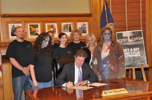 «Si usted está preparado para los zombies, está preparado para cualquier cosa«, se lee en el texto publicado por la División de Manejo de Emergencias del Gobierno de Kansas, todo esto avalado por el Gobernador Sam Brownback, quien firmó un acuerdo para este proyecto, posando además con varios «zombies».