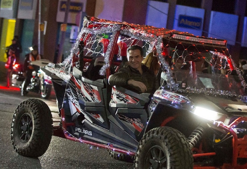 Adrián de la Garza hizo el recorrido de dos y medio kilómetros a bordo de una unidad tipo Razer adornada con foquitos y guirnaldas plateadas; al frente iban oficiales de tránsito vestidos de Santa Claus.