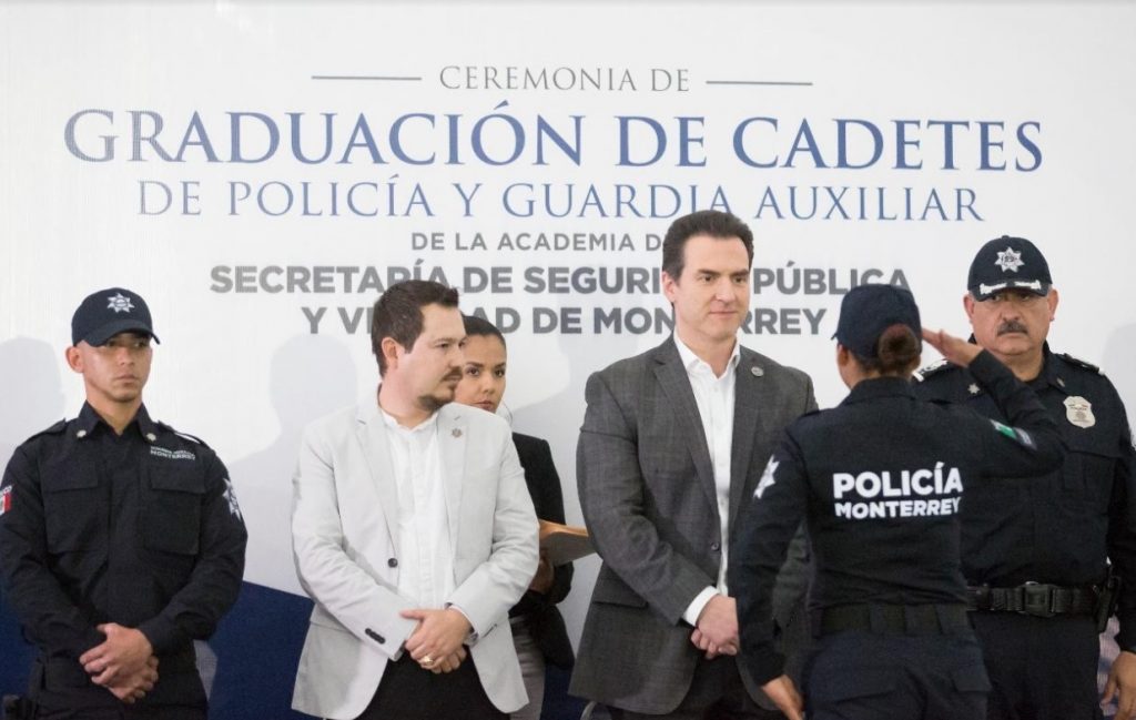El Alcalde de Monterrey, Adrián de la Garza Santos, encabezó la ceremonia de graduación de la décimo séptima generación de la formación inicial para policía y la segunda generación de la guardia auxiliar.