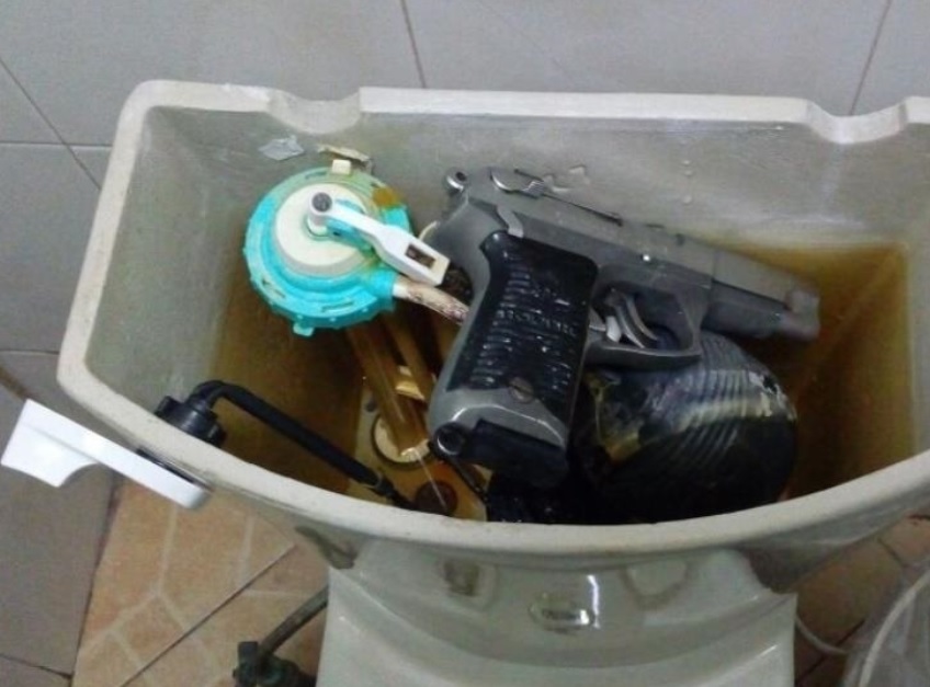 Cuando realizaba las labores de limpieza en un baño del restaurante Tacos Chilo en el Centro de la Ciudad de Monterrey, una empleada localizó un arma escondida en el tanque del sanitario, por lo que solicitó la presencia de autoridades en el lugar.