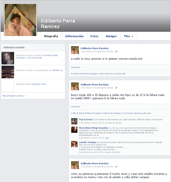 El hombre borró las fotos de su Facebook en donde se veía comprometida su esposa, sin embargo se puede observar que en las fotos de sus hijos busca quien se los cuide y se puede leer el resentimiento de éste hacia su todavía esposa.