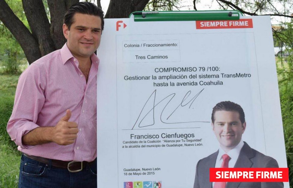 El candidato del PRI a la Alcaldía de Guadalupe, Francisco Cienfuegos, firmó su compromiso número 79, con el que se comprometió a gestionar la ampliación del servicio TransMetro.
