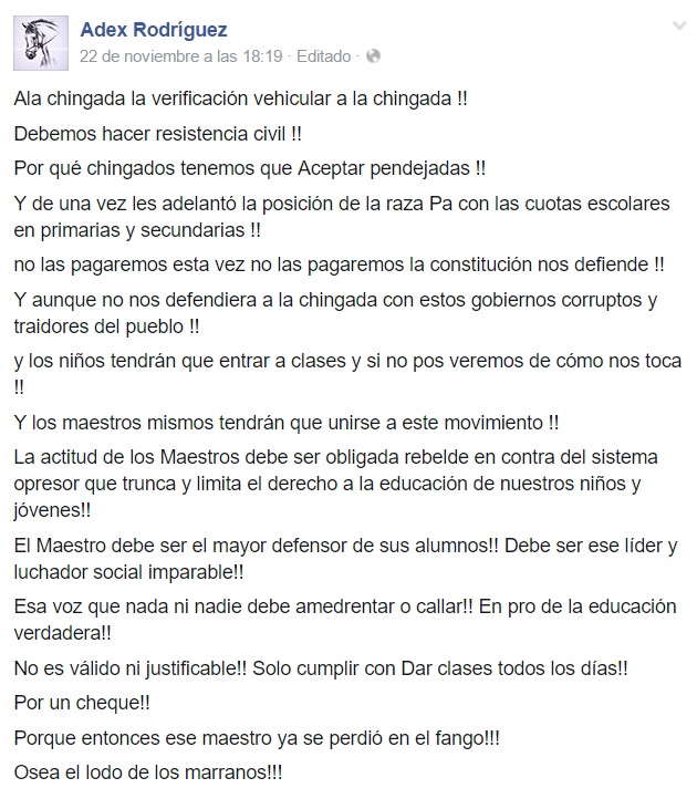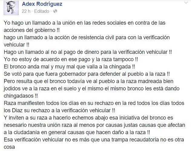Y es que mediante redes sociales el hermano del Gobernador, el señor Adex Rodríguez hace un llamado a una resistencia civil en contra del regreso al Estado de la verificación vehicular y en contra de las acciones del gobierno que amuelan más los bolsillos de la “raza”, ya que dijo que es una trampa recaudatoria de su hermano el Bronco.