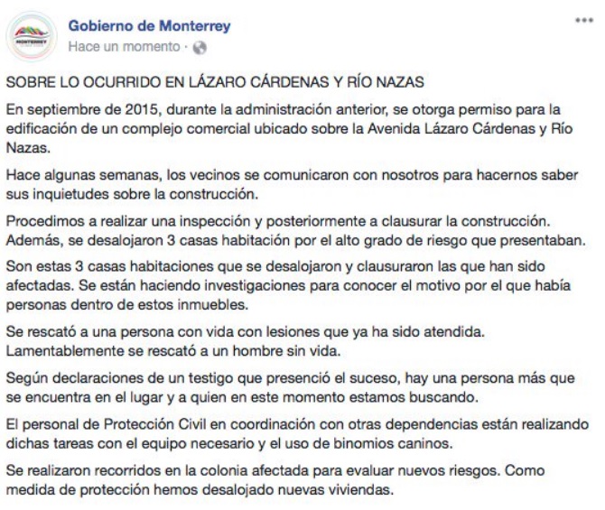 Luego del derrumbe de casas habitación en el cruce de Avenida Lázaro Cárdenas y Río Nazas, en la Colonia Antigua, el Municipio de Monterrey, encabezado por Adrián de la Garza Santos, dio a conocer mediante Comunicación Social, que hace un mes se dio la suspensión de obra, luego de que vecinos del sector solicitaran que Protección Civil realizará una inspección, por lo que se la Secretaría de Desarrollo Urbano y Ecología dio por suspendida la obra el pasado 1 de noviembre.