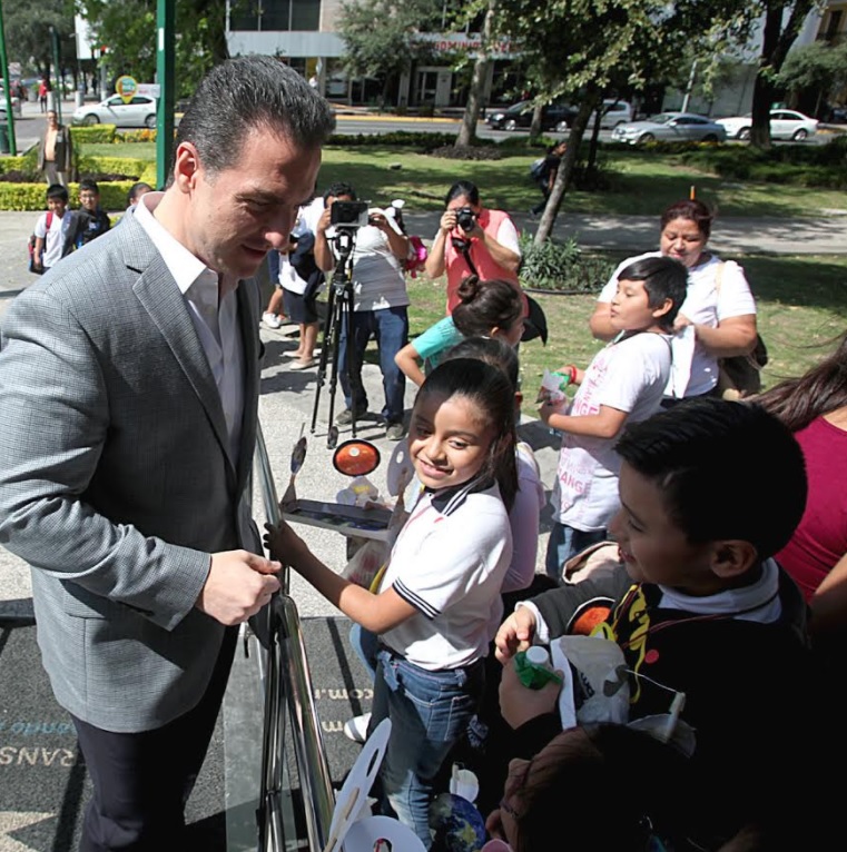 El Alcalde Adrián de la Garza acudió a los módulos de atención instalados en la explanada de la Plaza Zaragoza, donde se brinda información científica y de salud a niños de entre seis a 12 años de 16 estados del país.