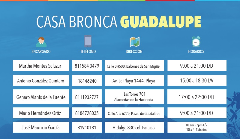 Por si quieren apoyar al Bronco, aquí les dejó algunas de las direcciones de las «casas broncas» a donde pueden acudir para estampar su firma de apoyo, pero recuerde llevar su IFE.