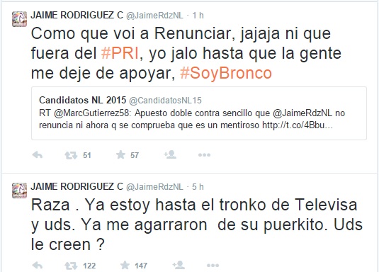 Creo firmemente que los nuevoleoneses no se dejarán engañar por un fulano que se dice bronco, independiente y ciudadano, que de eso no tiene nada, sabemos perfectamente quiénes están detrás de él, también sabemos que su intención real es llegar a la Presidencia y conocemos que organismos internacionales están usándolo como títere, espero que aquellos que ven a el bronco como un Dios comprendan que están siendo manipulados por alguien que a ni a sus hijas respeta.