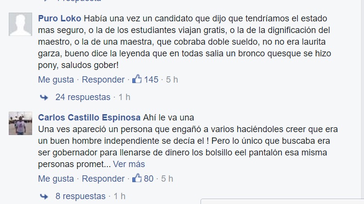«Había una vez un candidato que dijo que tendríamos el estado mas seguro, o la de los estudiantes viajan gratis, o la de la dignificación del maestro, o la de una maestra, que cobraba doble sueldo, no no era laurita garza, bueno dice la leyenda que en todas salia un bronco quesque se hizo pony«.