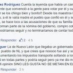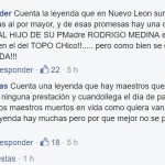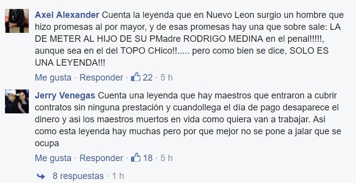 «Cuenta la leyenda que en Nuevo Leon surgio un hombre que hizo promesas al por mayor, y de esas promesas hay una que sobre sale: LA DE METER AL HIJO DE SU PMadre RODRIGO MEDINA en el penal!!!!!, aunque sea en el del TOPO CHico!!….. pero como bien se dice, SOLO ES UNA LEYENDA!!!»