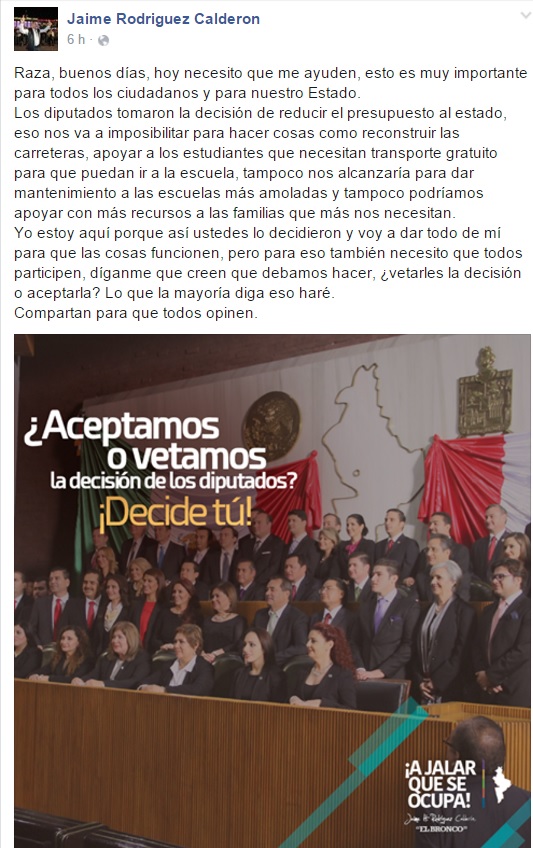Nótese la falta de Gobernabilidad en Nuevo León, Jaime Rodríguez Calderón, pidió mediante un post de Facebook ayuda a la “raza” para ver si veta o no la Ley de Coordinación Fiscal, por más que se deba a la ciudadanía él debería de tomar esa decisión, digo, se supone que el gobernaría, en ese caso mejor que renuncie y hacemos un consejo ciudadano para que tome las decisiones importantes para el Estado.