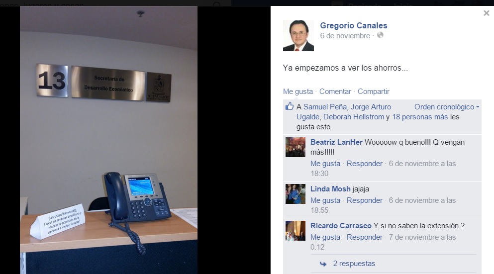 En el piso 13 de la Torre Administrativa esta esta dependencia y el Secretario Técnico de la Secretaría de Desarrollo Económico de Nuevo León, Gregorio Canales Ramírez, publicó en su cuenta de Facebook una imagen en donde presume los “ahorros” de la dependencia que dirige Fernando Turner Dávila, bueno, está bien que optimicen recursos pero eso ya es algo exagerado, cómo es que para ahorrase unos pesos corren a la o las recepcionistas del lugar, digo, al menos ganaran 80 mil pesos mensuales pues adelante, pero lo que gana regularmente una recepcionista es algo alrededor de los 10 mil pesos mensuales.
