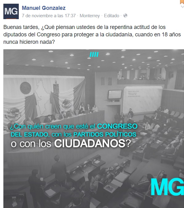 Lo que Jaime Rodríguez debería de hacer es correr a Manuel, y poner a Fernando Elizondo Barragán a que repare el enlace que debe de haber entre el Gobierno y el Congreso, hasta pareciera que Manuel González le está metiendo zancadillas a su propio jefe para que este se hunda más en el fango, definitivamente Jaime Rodríguez va en picada, gracias a sus broncojadas y a las boberías de sus funcionarios.