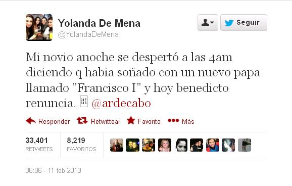 En donde en la red social Twitter Yolanda De Mena, publica en su cuenta un inocente tuit en donde comparte uno de los sueños que su novio tuvo el día 11 de febrero de éste año.