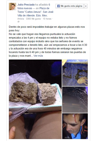 «Dentro de poco será imposibles trabajar en algunas plazas esto nos pasó hoy: No se vale que hagan eso llegamos puntuales la actuación empezaba a las 4 pm y el equipo no estaba listo y no fuimos contratados con equipo incluido sino que los señores de evento se comprometieron a tenerlo listo, aún así empezamos a tocar a las 4:30 y la actuación era de una hora 40 minutos sin embargo seguimos tocando hasta las 6:40 pm y de todas formas cerraron las puertas de la plaza y nos mantuvieron secuestrados nos aventaron con piedras y golpearon a un músico, al parecer el Presidente Municipal (que fue el que ordenó el cierre de la plaza) estaba ebrio se llama Arturo Piña García y el ataque que nos hicieron fue de parte del personal del municipio nosotros estuvimos en el lugar del evento desde las 2:00… Lo mas triste que las autoridades viendo todo y no hicieron nada por parar el asunto, sino que fueron los instigadores de lo que nos paso Lugar del evento PLAZA DE TOROS DE SAN JOSÉ VILLA ALLENDE ESTADO DE MÉXICO».