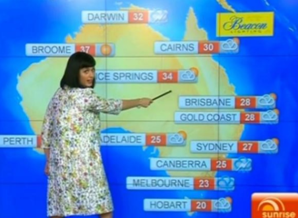 Katy acudió al programa de televisión «7 Sunrise News«, en donde dio el clima e hizo gala de sus labores comunicativas. Sin embargo algunos fans señalaron sentir decepción porque Perry lució un vestido muy simple, algunos bromeaban y decían que preferían a la cantante en traje de baño.
