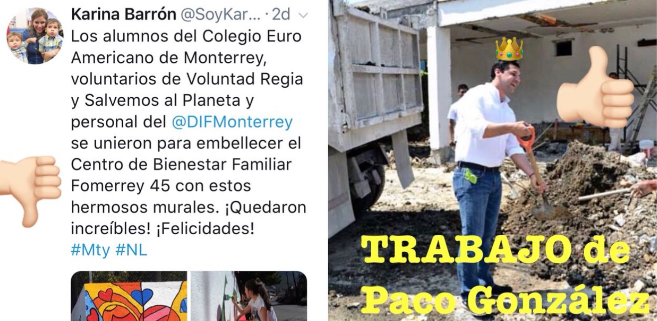La pura verdad es que Karina ya no sabe qué hacer para colocarse en el gusto de la gente y que le regalen su voto como Diputada Local, que hasta tuvo que colgarse medallas que no le corresponden, y se le ocurrió subirse al carrito de la rehabilitación del Centro de Bienestar Familiar Fomerrey 45, trabajos que encabezó el DIF de Monterrey, organizados por Francisco González... ¡Quien será candidato a la Diputación Local por el Distrito 8! Sí, el mismo Distrito que la Barrón quiere. Increíble lo bajo que ha caído esta mujer, que a falta de trabajo propio tiene que colgarse medallas ajenas, y lo peor, medallas que le corresponden a quien va a competir contra ella. Lo bueno es que el trabajo de Paco González es de Paco González, quien realmente se desempeñó de forma excelente en su paso como Director de Centros de Bienestar Familiar.