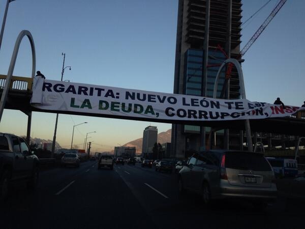 La semana pasada pusieron una manta en el Puente del Papa en contra de la alcaldesa de Monterrey Margarita Arellanes Cervantes, en donde le reclamaban que dejara de grillar y se pusiera a trabajar, pues ahora sus chalanes no quisieron quedarse con los brazos cruzados, y el día de hoy amanecieron temprano y colgaron una manta, pero más grande y claro con consignas a favor.