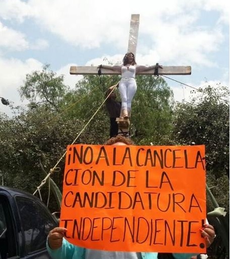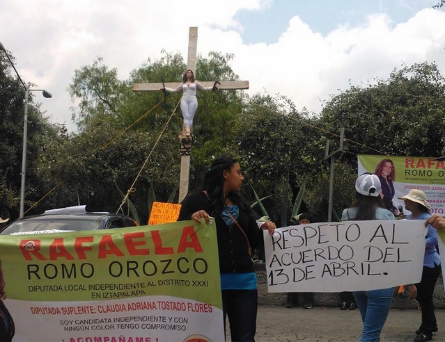 Como medida de protesta ante el retiro de su registro para participar en estas Elecciones 2015 y no aceptar la resolución del INE, Rafaela Romo Orozco, quien pretendía convertirse en diputada local independiente por el Distrito XXXI de Iztapalapa de la Asamblea Legislativa del Distrito Federal, se crucificó el día de hoy al exterior del Instituto Nacional Electoral.