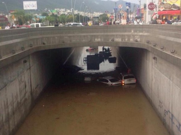 Ante las fuertes lluvias que nuevamente colapsaron algunas de las principales avenidas de la Ciudad de Monterrey y su área metropolitana, decenas de automovilistas se quedaron varados, cuando el paso vial en Mederos se convirtió en una gran cascada.
