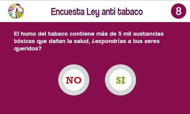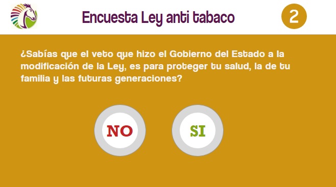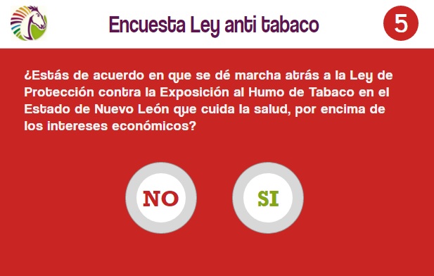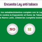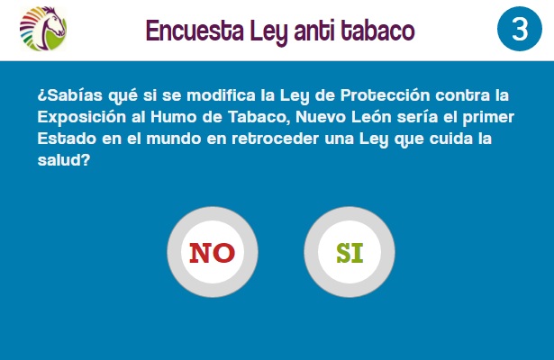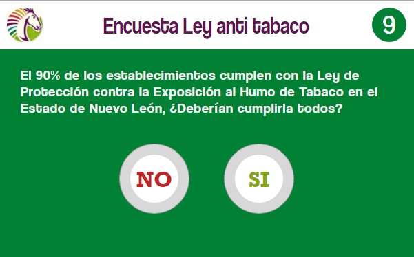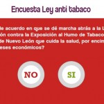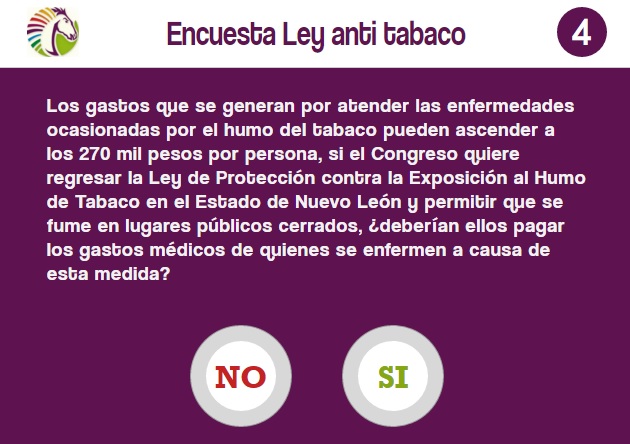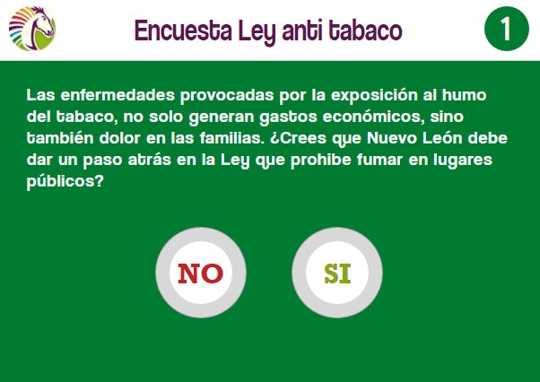 Para conocer la LEY DE PROTECCIÓN CONTRA LA EXPOSICIÓN AL HUMO DEL TABACO DEL ESTADO DE NUEVO LEÓN y su Reglamento vigentes en el estado haz click aquí. Es responsabilidad de gobierno del estado de cuidar y garantizar la salud de la población, es por eso que me interesa saber su opinión» expone Jaime Rodríguez en su encuesta.