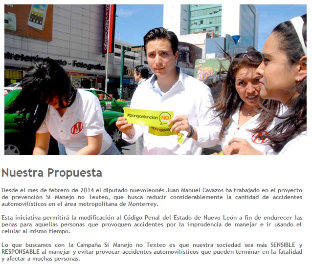 Bueno pues, como les decía, encontré una comunidad en Facebook perteneciente al 5X de nombre “Si Manejo No Texteo” ¿le suena? exacto, es el mismo eslogan de la iniciativa-campaña de concientización del Diputado Local del PRI, Juan Manuel “Meme” Cavazos Balderas, la cual por cierto sabemos de buena fuente que le costó mucho trabajo lograr concientizar primeramente a sus compañeros del Congreso del Estado para convertirla en Ley.