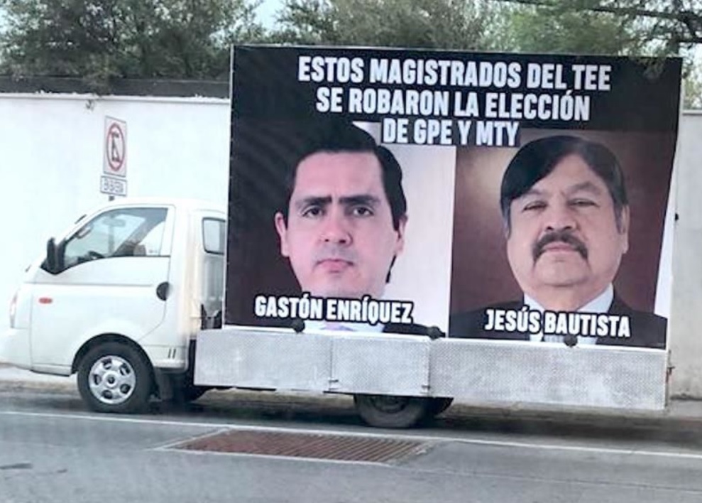 «Voy a presentar una denuncia penal contra quien resulte responsable por difamación, calumnia y amenazas, porque el lunes se presentó en el colegio de mis hijos, menores de edad, un vehículo de publicidad, con las fotos del magistrado Bautista y la mía, en donde se nos imputaba un delito, el supuesto robo de las Alcaldías de Monterrey y Guadalupe”