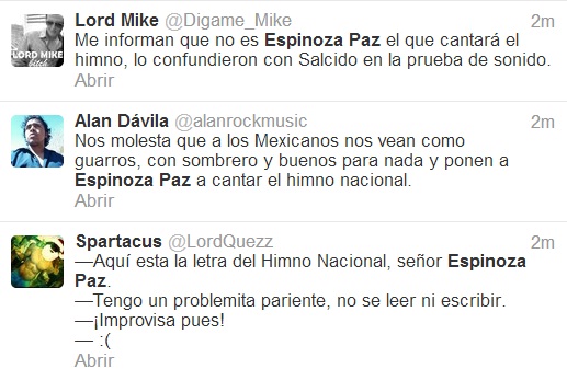 La comunidad tuitera expresa su sorpresa al enterarse que en poco menos hora y media Espinoza Paz podría como muchos lo han hecho, equivocarse en alguna palabra o estrofa del Himno Nacional.